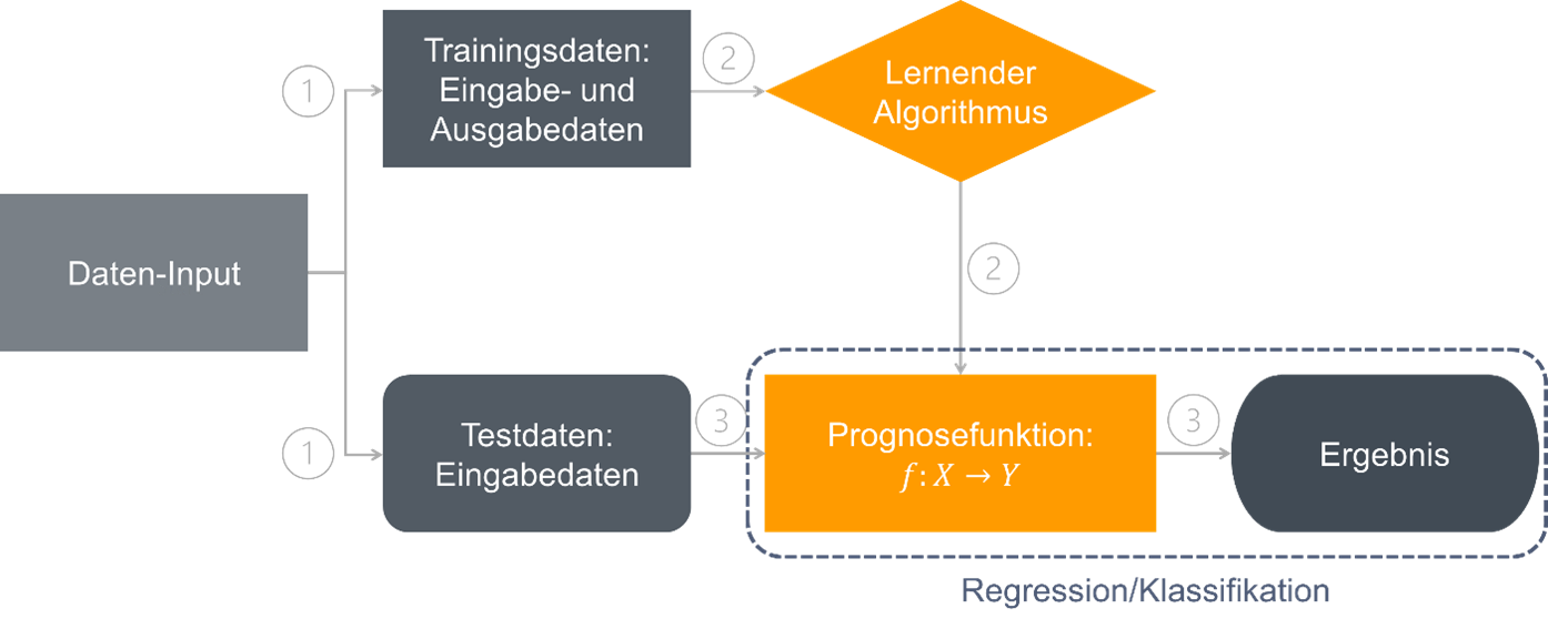 Hieraus wird die Prognosefunktion gebildet, über die dann auch neue Daten mit unbekanntem Ergebnis verarbeitet werden können. Anhand seiner Lernerfahrung liefert der Algorithmus hierfür nun Prognosen für das zu erwartende Ergebnis.