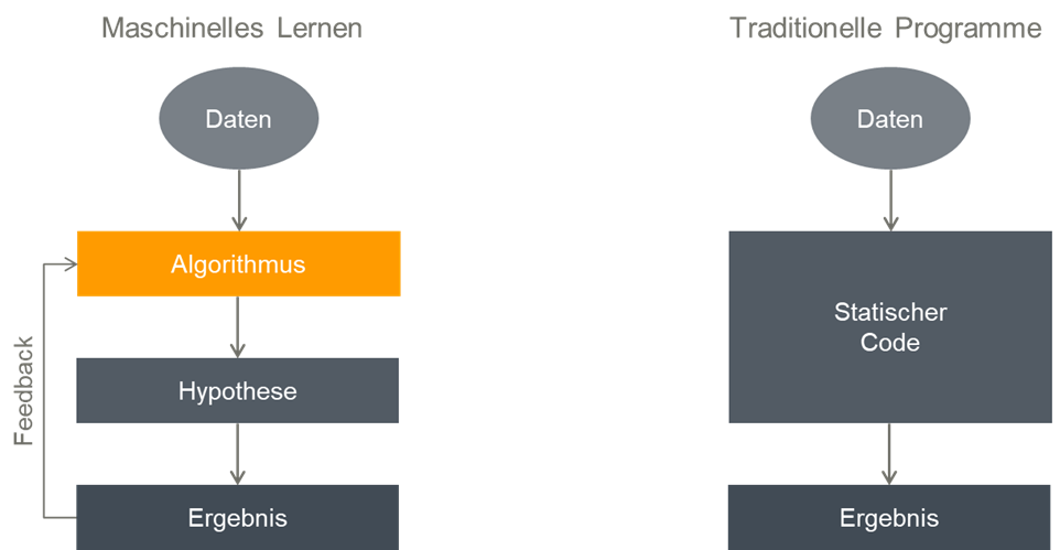 Während bei traditionellen Programmen der gleiche statische Code die Eingabedaten interpretiert, wird diese Aufgabe bei Anwendungen maschinellen Lernens von einem Algorithmus übernommen. Vereinfacht gesagt erstellt dieser eine oder mehrere Hypothesen aus den eingespeisten Daten und überprüft anhand von Vergangenheitswerten deren Plausibilität. Das endgültige Ergebnis fließt dann wiederum in den Algorithmus selbst ein, wodurch dieser sich anpasst und für zukünftige Fälle verbessert.
