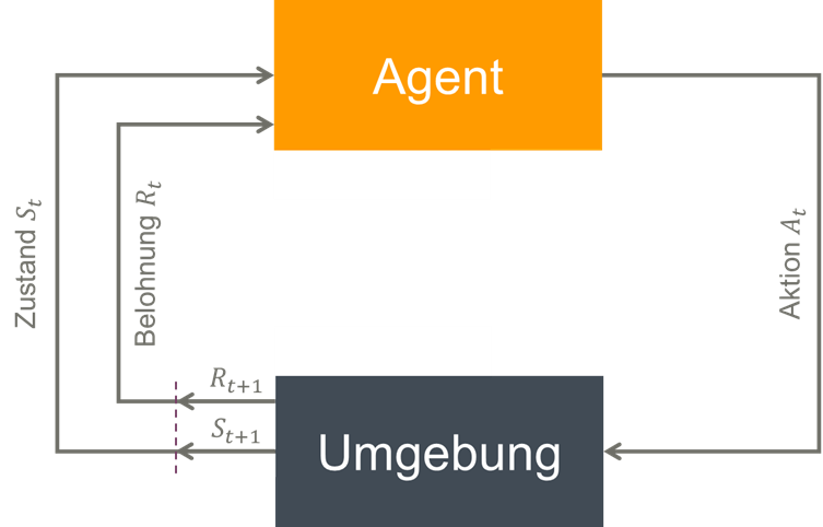 Beim verstärkenden Lernen wird die Künstliche Intelligenz in Form eines handelnden Agenten immer im Zusammenhang mit ihrer Umwelt betrachtet. Grundlegend hat die KI, die notwendigen Mittel, um ihre Umgebung zu beeinflussen.