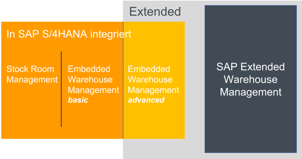 Mit der Umstellung zu SAP S/4HANA erhalten Sie vier verschiedene Möglichkeiten, Ihre Lagerverwaltung abzubilden: Stock Room Management, Embedded Warehouse Management Basic und Advanced und Extended Warehouse Management. Wie schon erwähnt, werden wir in diesem Beitrag jedoch zunächst nur auf die im S/4HANA-System integrierten Versionen näher eingehen.